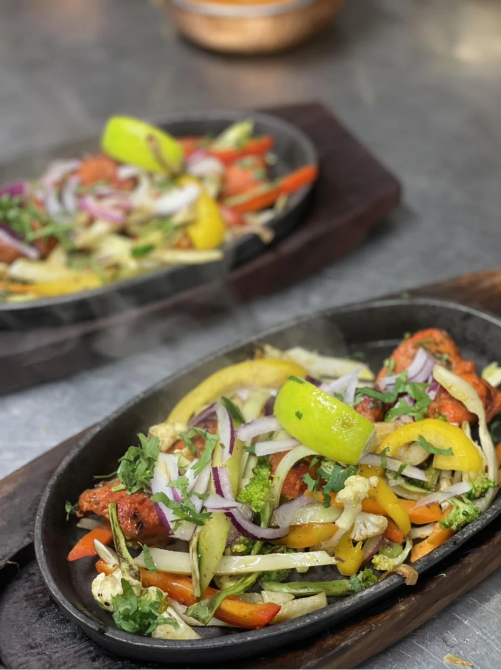 Grillade kycklingfilé marinerad med tandoorikryddor serveras i het sizlar