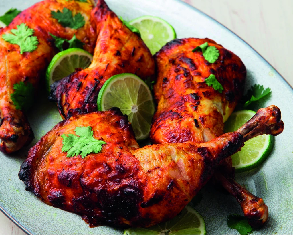 Grillade kycklingklubba, marinerade i tandoorikryddning, serveras med sallad och masalasås